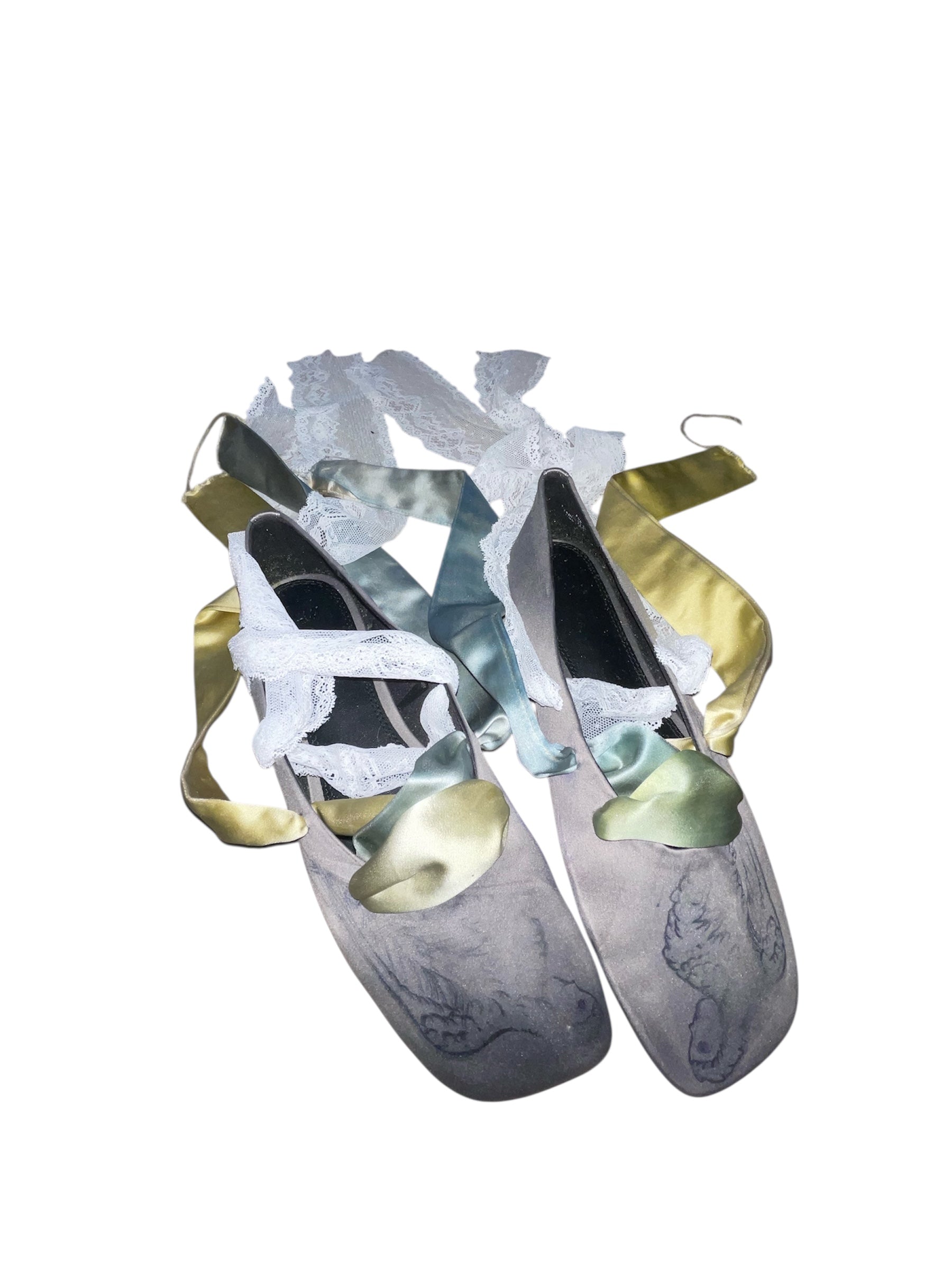 made of grey satin, enhanced with genuine silk ribbons, hand dyed in pastel colors and lace details, hand-printed