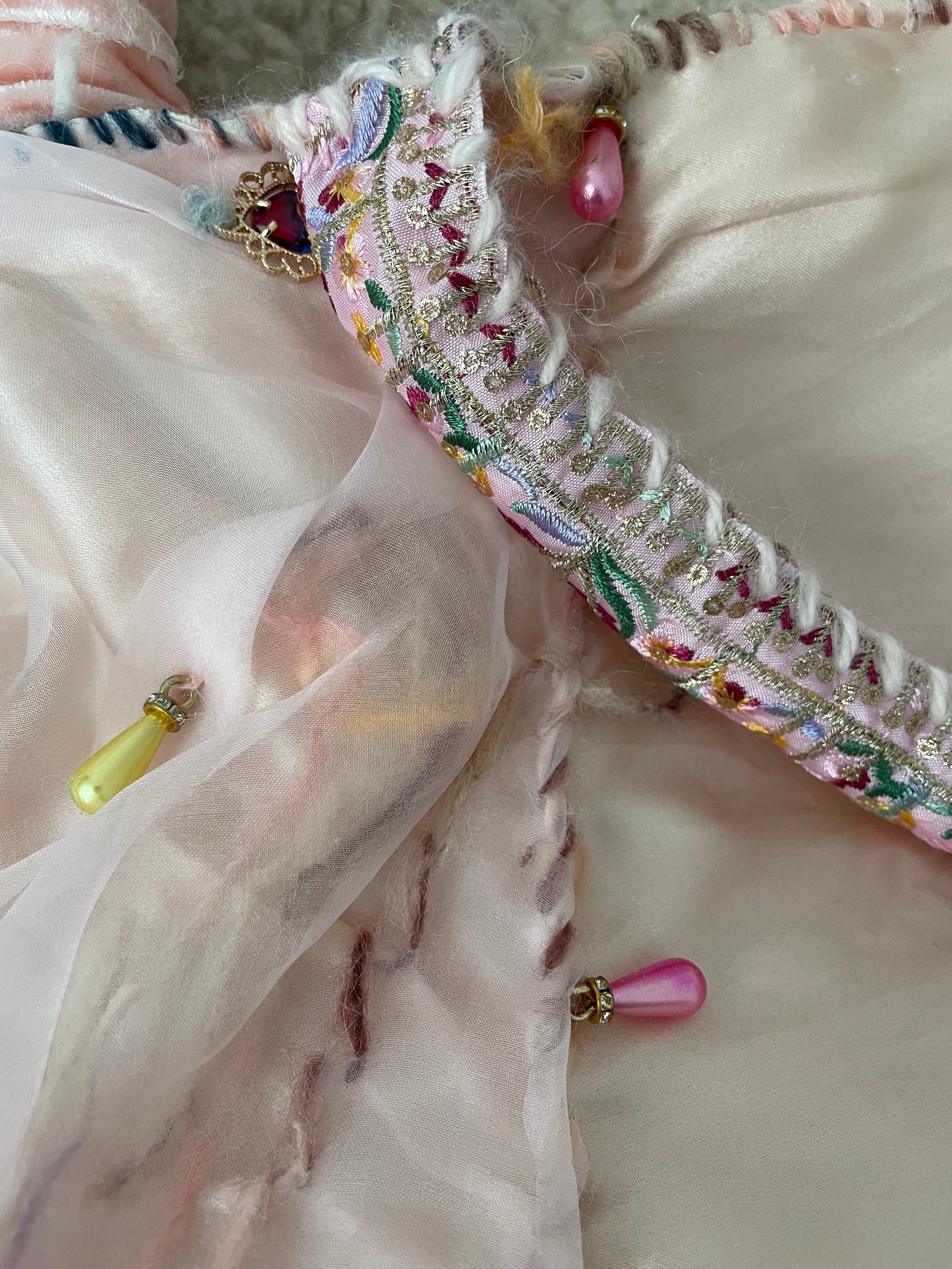 with collage layered lace details and hqndsewn stitches with alpaka yarn
